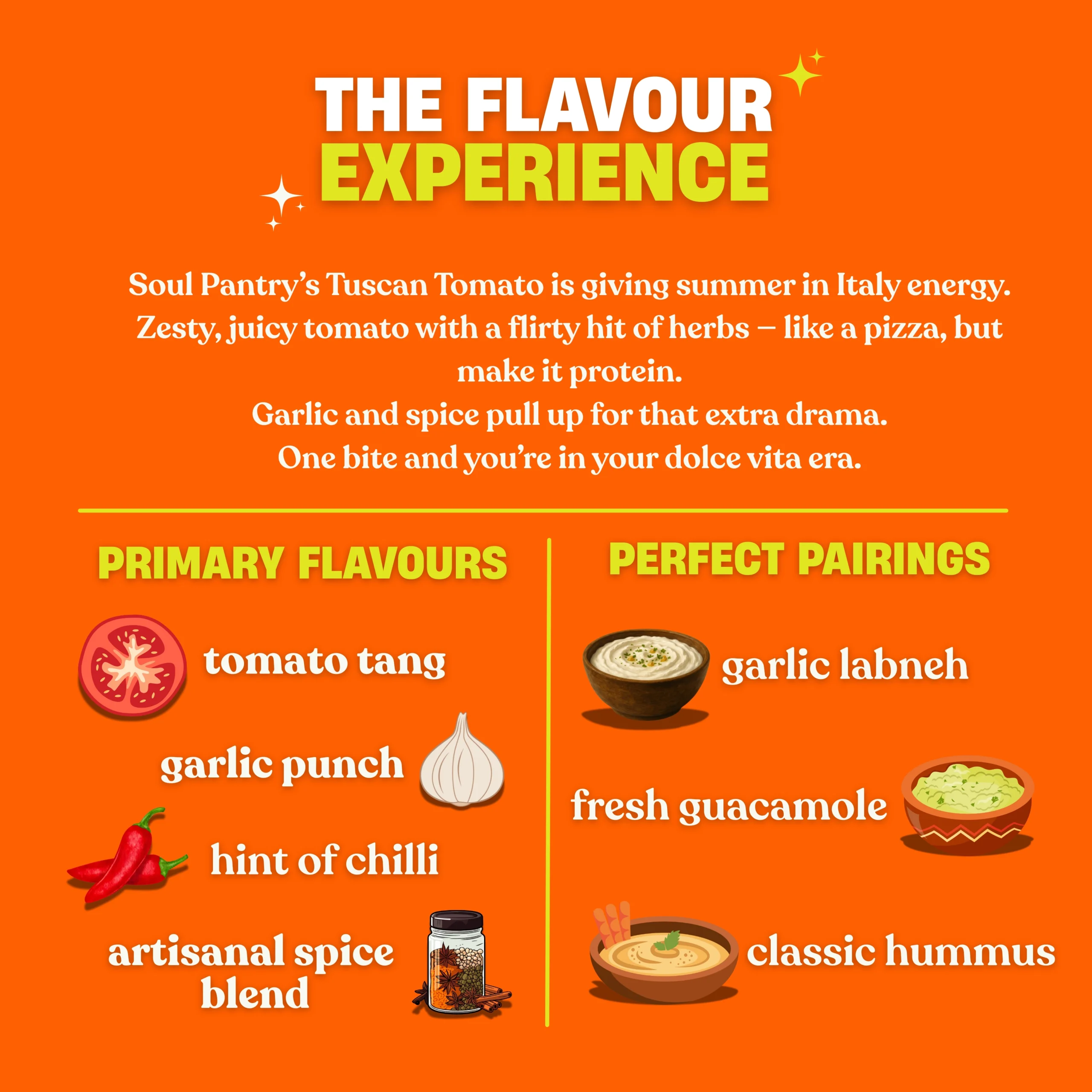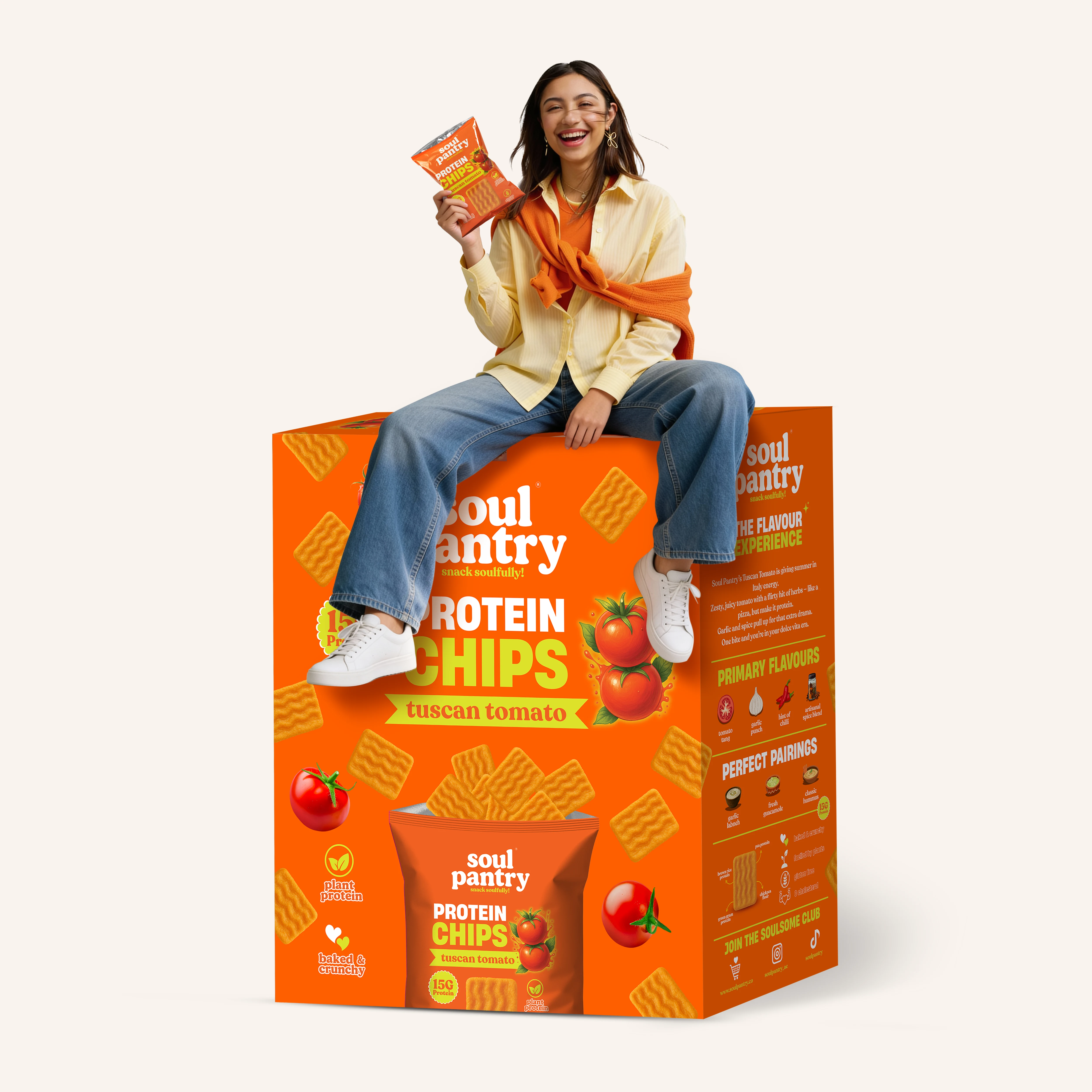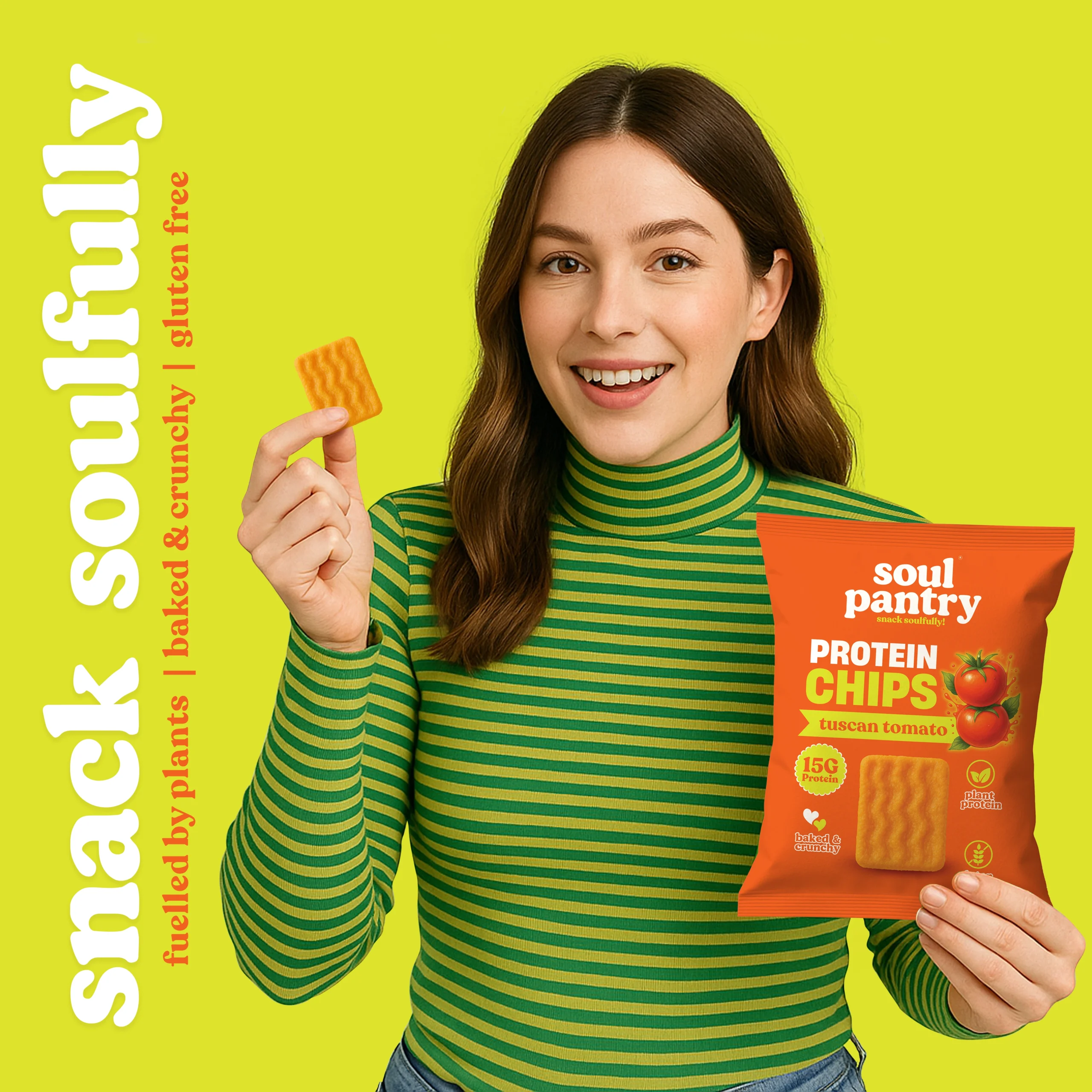 Soul Pantry Tuscan Tomato Protein Chips capture the bright, rustic flavours of Italy in every crunchy bite. Seasoned with a zesty blend of sun-ripened tomatoes, herbs, garlic, and a touch of olive-inspired richness, these baked, gluten-free chips offer a warm, savoury, tangy profile that tastes straight out of Tuscany. With 15g natural protein and a light, crispy texture, it’s the perfect wholesome snack for a flavour-packed pick-me-up.